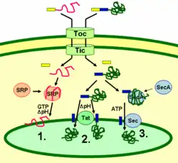 Preprotein pro chloroplasty může obsahovat stromální importní sekvenci nebo stromální a thylakoidovou cílící sekvenci. Většina preproteinů je přemístěna prostřednictvím komplexů Toc a Tic umístěných uvnitř obalu chloroplastu. Ve stromě je stromální importní sekvence odštěpena a poskládána do finální formy.