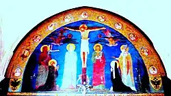 Nástěnná malba Kalvárie v Císařské kapli je kopií zničené malby původně navržené Desideriem (Peterem) Lenzem (1832–1928) pro kapli Torretto v italském klášteře Montecassino. Nástěnnou malbu v Emauzském klášteře provedl Gabriel (Jacob) Wüger (1829–1892), blízký Lenzův spolupracovník. Wüger v Emauzském Ukřižování využil své zkušenosti s vyobrazením Kristova ukřižování, které namaloval v Římě v roce 1869. Tento obraz je považován za první malbu ve stylu Beuronské umělecké školy.[4]