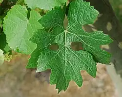 List je středně velký, pětiúhelníkovitý, výrazně a hluboce pěti- až sedmilaločný s hlubokými, lyrovitými výkroji s oblým až plochým dnem, často se zoubkem. Vrchní strana čepele listu je tmavozelená, středně puchýřnatá, spodní jemně chloupkatá. Řapíkový výkroj je lyrovitý, uzavřený, s okrouhlým průsvitem, někdy se zoubky na lalocích, řapík je krátký až středně dlouhý, tmavozelený s červenofialovým odstínem, žilnatina listu v oblasti napojení řapíku je narůžovělá. List svým členěním působí velmi dekorativně, na podzim je vínově červeně skvrnitý.