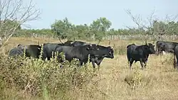 Zdejší býci mají černou barvu a rohy zaokrouhlené nahoru. Žijí zde polodivoce hlavně v bažinách. Jsou menšího vzrůstu a prodávají se na býčí zápasy nebo je jejich maso použito jako pokrm v místních dušených jídlech.