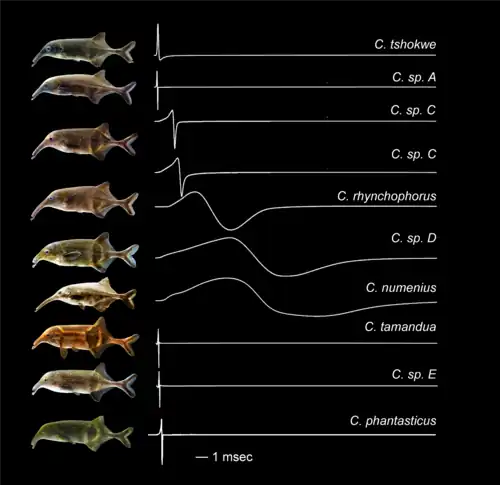 - ↑ Lamanna, F., Kirschbaum, F., Ernst, A.R.R., Feulner, P.G.D., Mamonekene, V., Paul, C. & Tiedemann, R. Species delimitation and phylogenetic relationships in a genus of African weakly-electric fishes (Osteoglossiformes, Mormyridae, Campylomormyrus). Molecular Phylogenetics and Evolution. 2016, s. 8–18. doi:10.1016/j.ympev.2016.04.035. PMID 27143239.