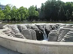 Betonová fontána je součástí bazénu. Z vodní nádrže stéká voda po stupních (vrstvách), které představují kaňon.