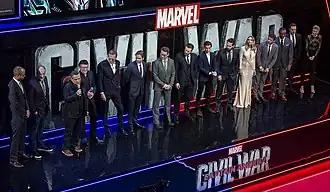 Herci a členové štábu filmu Captain America: Občanská válka na londýnské premiéře. Zleva: producenti Nate Moore a Feige, režiséři Russoové, Bettany, Brühl, Downey, Evans, Holland, Rudd, Olsenová, Renner, Mackie, Stan a VanCampová