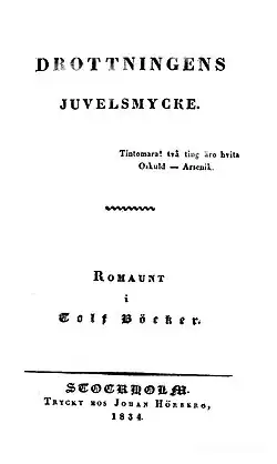 - Drottningens Juvelsmycke (1834, Královnin šperk), žánrově román nebo knižní drama odehrávající se těsně před a v době atentátu na krále Gustava III. roku 1792. V románu vystupuje androgynní primabalerína Tintomara, která je neuvěřitelné krásná. Muži i ženy jsou uchváceni jejím zevnějškem, ale Tintomara jejich lásku neopětuje. Pohlaví Tintomary není známo, je vnímána jako muž nebo žena podle toho, kdo se do ní zamiloval. V románu je nevlastním sourozencem nezletilého krále Gustava IV. Adolfa. Zcizí královnin diadém, aby jej ukázala své matce, tím se zaplete do atentátu na krále a stane se nakonec nevinnou obětí bezohledných a nesmyslných pletich.