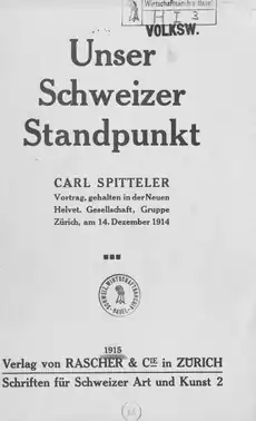 ↑ALTORFER, Sabine. ERSTER WELTKRIEG: Eine politische Rede kostete Carl Spitteler fast den Literatur-Nobelpreis [online]. az Aargauer Zeitung, 2014-04-01 [cit. 2016-03-23]. Dostupné v archivu pořízeném dne 2016-03-04.