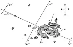 Sluneční skvrny dne 1. září 1859 zakreslené Richardem Christopherem Carringtonem. A a B označuje počáteční pozice intenzivního výboje (záblesku), jenž se posouval 5 minut ve směru k C a D, než zanikl