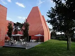 Stavba, které dominují dvě jehlanovité věže, nepřesahující okolní vzrostlé stromy, se rozkládá na ploše 3 307 m² a je z červeného, monolitického, ve hmotě obarveného betonu. Výstavba proběhla v letech 2005–2008 a bylo při ní použito 3 810 m³ betonové směsi obarvené 18 t barevného pigmentu. Interiér stavby je opatřen světlou omítkou, na podlahy byla použita šedomodrá mramorová dlažba z místních zdrojů. Kromě výstavních a technických prostorů se v budově nachází též obchod, kavárna s atriem a přednášková místnost pro 200 posluchačů.[2]