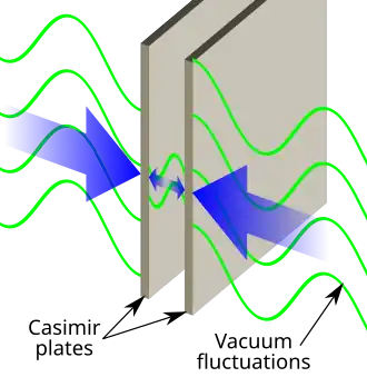 Casimirův jev (Casimirův efekt, Casimirova síla) se vysvětluje jako projev existence párů virtuálních částic ve vakuu. Tento koncept ovšem není potřeba k vysvětlení tohoto jevu.[1] Jev nastává v případě, že se velmi blízko sebe ocitnou například dvě nenabité desky, které by se vzhledem k absenci náboje neměly navzájem silově ovlivňovat. Materiál desek však ovlivňuje výslednou velikost síly.