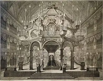 - Castrum doloris císaře Rudolfa II. z roku 1612 v katedrále sv. Víta v Praze mělo na stupňovitém pódiu katafalk mezi pod čtyřmi sloupy architektury s tympanonem, baldachýn měl tvar kupole mezi obelisky a svíce na něm. Dvě sochy andělů se svícemi stály po obou stranách katafalku.[2] Tato triumfální architektura, určená císařům a králům, měla od renesance své paralely také v nižších nižších sférách společnosti.