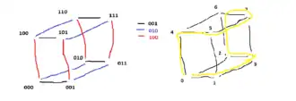 Vraťme se teď ke konstrukci Cayleyho grafu z obrázku. Sousední vrcholy podél kruhu jsou spojeny hranami, které reprezentují generátory grupy (C2)5. Zbývá nakreslit hrany uvnitř kruhu. Obrázek jasně ukazuje jak to udělat. A ještě jedna zvláštnost. Cesta v grafu podél kruhu se jmenuje Hamiltonův cyklus. Takových H. cyklů je v hyperkrychli více. Na vedlejším obrázku hyperkrychle (C2)3 je jednoduchá ilustrace Hamiltonova cyklu (obarveno žlutě).