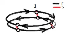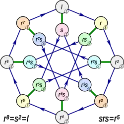 Z grupového hlediska kruhy na obrázku reprezentují cykly, odpovídající relaci r3 = 1 Všimněte si, že cykly v protilehlých rovinách mají opačné směry. Je to dáno relací r.s.r.s = 1 . Vzhledem k symetrii Cayleyho grafu libovolný vrchol se může označit prvkem grupy „1“ (identita). Z takto jednou označeného vrcholu „1“ lze pak „cestovat“ po zbývajících vrcholech a markovat je odpovídajícím součinem generátorů. Protější cykly jsou v grafu spojeny neorientovanou hranou. Toto je užitečná konvence. Obecně dvě orientované hrany, které odpovídají relaci s2 = 1, které by se podle definice měly kreslit jako dvě hrany s šipkami proti sobě, se kreslí zjednodušeně jako jedna neorientovaná hrana.