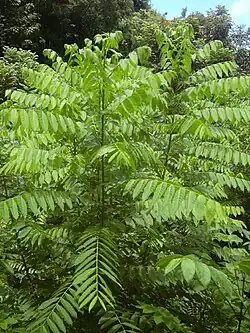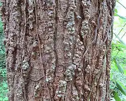 Listnatý strom rostoucí ve vlhkých tropických a subtropických lesích, jenž bývá vysoký 30 až 40 m a má zaoblenou korunu. Kmen má kůru červenohnědou až šedou, v mládí hladkou a v pozdějším věku hluboce vrásčitou. V lese bývá až do výšky 20 m bez větví, někdy mívá kořenové náběhy až 2 m vysoké. Větve s lenticelami jsou střídavě porostlé řapíkatými, 15 až 50 cm dlouhými, sudozpeřenými listy, které mají po pěti až čtrnácti párech vstřícně vyrůstajících lístků s řapíčky 2 cm dlouhými. Lístky jsou tuhé, oboustranně lysé, 8 až 15 cm dlouhé a 3 až 6 cm široké, slabě šikmé, podlouhle vejčité až vejčitě kopinaté, na bázi úzké, asymetricky zaoblené, na vrcholku zašpičatělé, po obvodě celokrajné, střední žilka je do lístku zapuštěna a pérovitě uspořádaných sekundárních žilek bývá deset až dvanáct. Palisty nejsou u tohoto druhu vyvinuté.