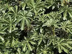 Veliké listy, štítnatě postavené, jsou jednoduché, střídavé s dlouhými řapíky, mají čepele měřící 30 až 40 cm. Dlanitě se rozdělují do 7 až 11 obvejčitých lístků, hlavní žíla lístku mívá 14 až 20 páru sekundárních žilek. Svrchu bývají tmavě zelené, zespodu jsou plstnaté, barvy šedé nebo stříbřité. Vytvářejí převislé „deštníky“ o průměru až 1 m. Ještě nerozvité listy jsou nápadně červenavé barvy. Každý odpadnutý list nechává na větvi jizvu, podle rozestupu těchto značek lze určit celkové stáří i životní podmínky stromu v určitém časovém období (sucho, značky jsou blízko).