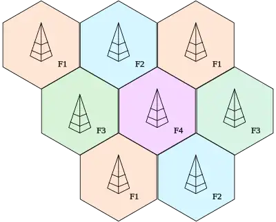Buňkový rádiový systém. Geografická oblast, která má být pokryta rádiovou službou, je rozdělena na buňky pravidelných tvarů, které mohou být šestiúhelníkové, čtvercové, kruhové nebo jiných pravidelných tvarů, ale šestiúhelníkové buňky jsou nejpoužívanější. Každé z buněk je přiděleno několik frekvencí (f1 - f6), které mají odpovídající rádiové základnové stanice. Stejné frekvence mohou být použity v jiných buňkách, za předpokladu, že stejné frekvence nejsou znovu použity v sousedních buňkách, což by způsobovalo mezikanálové rušení.