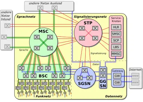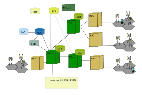 Tato síť je základem sítě GSM. Mnoho funkcí, které síť provádí, aby poskytla účastníkovi požadované služby včetně řízení mobility, registrace, spojování hovorů, a předávání mezi buňkami.