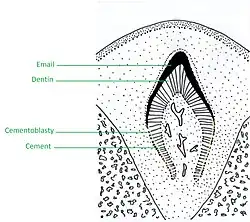 Zubní cement je mineralizovaná vrstva, která pokrývá kořen a krček zubu a svou strukturou se velmi podobá kosti. Vznik zubního cementu se nazývá cementogeneze a hlavní roli v ní hrají právě cementoblasty. Cementoblasty se ukládají jako epiteloidní vrstva na povrchu dentinu a staví cement, podobně jako osteoblasty vytváří kost. Rozlišujeme cement acelulární (primární) a celulární (sekundární), které se ukládají ve vrstvách.[2]