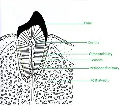 - ↑ James K. Avery. Oral Development and Histology, 3. vyd.. New York: Thieme medical publishers, 2001. ISBN 978-31-310-0193-1. S. 480 stran.