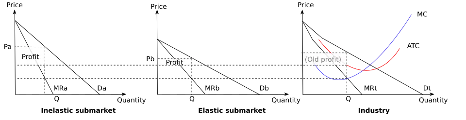 Firma se rozhodne, jaký objem produktů prodávat na každém trhu tak, že se podívá na průnik mezních nákladů s mezními zisky (maximalizovaný zisk). Tento objem je pak rozdělen mezi výše zobrazenými dvěma trhy tak, aby byl výše mezního zisku v rovnováze. Optimální objemy výroby jsou tedy Qa a Qb. Z poptávkové křivky každého trhu můžeme určit cenu pro maximalizovaný zisk Pa a Pb.