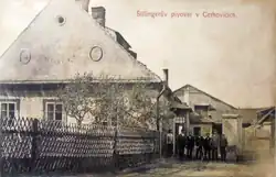Šillingerův pivovar v Cerhovicích před první světovou válkou na dobové pohledniciStarý (později Šillingerův) pivovar – Starý pivovar je nejstarší podnik v Cerhovicích. Vznikl již v roce 1516. Založen byl jako výsadní v době, kdy Cerhovice byly povýšeny na městečko. Pivovar vyhořel při velkém požáru roku 1678, ale jeho činnost to nezastavilo. Roku 1705 potvrdil Josef I. výsady udělené městečku v dávné minulosti a s tím pochopitelně i právo vařit pivo. Pivovar byl právovárečný až do roku 1886, kdy jej koupil Čeněk Šillinger, který všechna tato práva od všech vykoupil. Šillingerovi museli být vesměs podnikaví lidé. V archivech [Hendrich] našel doklady o pachtech (pronájmech) hostinců – třeba 28. června 1887 vydražil Čeněk Šillinger pacht restaurace radnice a ještě v tom samém roce dostal koncesi na hostinec na Doubravce (dnešní hotel a restaurace Bouchalka). V posledním desetiletí 19. století rostla výroba piva a v každé roční kampani se ho uvařilo víc než 5 000 hl. Rekordní výstav byl v kampani 1896–1897, a to 5 760 hl. V roce 1890 Čeněk Šillinger ohlásil na městský úřad, že ustanovil Františka Mayera za svého zplnomocníka.[15] Hendrichovi však odporuje Monografie Hořovicka a Berounska – v každé knize uváděn jiný rok odkoupení pivovaru Šillingerem a z knihy J. Hendricha vychází najevo, že po dobu éry Šillingerů vedli pivovar Šillingerové dva, oba Čeňkové. Zde ovšem opět oponuje Monografie Hořovicka a Berounska, kde je psáno, že „Roku 1876 přešel [pivovar] do vlastnictví Čeňka Šillingra, v jehož rodě se udržel, a je zajímavé, že nynější majitel je třetí z tohoto rodu a třetí Čeněk.“[14] Roku 1898 vznikl na druhé straně Cerhovic nový Mayerův pivovar a následoval tak útlum výroby. Od počátku 20. století do války se roční výstav pohyboval okolo 1 500 – 2 000 hl. Po válce prošel pivovar zejména technologickou rekonstrukcí a produkce piva opět vzrostla; ročně se uvařilo okolo 4 000 hl piva. Vařilo se světlé pivo „ale“ s nízkým obsahem alkoholu, pro stáčení do láhví se však vyrábělo i dvacetistupňové. Další druh piva vařený v Šillingerově pivovaru bylo tzv. zdravotní černé pivo Dobroděj. V roce 1917 Čeněk Šillinger zemřel a pivovar převzal jeho syn Čeněk Šillinger mladší. V Monografii Berounska a Hořovicka z roku 1928 se uvádí, že pivovar ročně vystavuje 4000 – 5000 hl piva a zaměstnává 6 – 7 lidí. Ve 30. letech 20. století v době hospodářské krize byl roční výstav cca 1 500 hl. Pivo bylo v té době dodáváno do sedmi hospod v Cerhovicích a okolí. Roku 1942 byl provoz pivovaru ukončen výměrem tehdejšího protektorátního ministerstva hospodářství. Tento výměr byl důsledkem odbojové činnosti Čeňka Šillingera, který byl zanedlouho poté zastřelen příslušníky gestapa (více vizte kapitolu Čeněk Šillinger v odbojové činnosti). Část objektu pivovaru od té doby chátrá, část tvoří obývaný obytný dům a v části pivovaru funguje firma Kovodružstvo.
