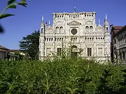 Fasáda kostela je bohatě zdobená, typický příklad lombardské architektury; každá část je dekorovaná reliéfem, mramorem a sochami. Pracovali na ní Cristoforo Mantegazza a Giovanni Antonio Amadeo. Portál v klasickém stylu je od Briosca (1501). Basreliéf zobrazuje Historii Certosy. Nad středovým obloukem je balkónek se třemi okny a nad ním centrální kruhové okno.