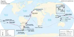 První cestu kolem světa v letech 1519 až 1522 uskutečnila námořní expedice lodi Victoria, kterou až do své smrti roku 1521 vedl portugalský mořeplavec Fernão de Magalhães a dokončil jeho nástupce Juan Sebastián Elcano.[1] Cestu ze Sevilly západním směrem přes Atlantik, Tichý a Indický oceán tehdy kromě Elcana přežilo 18 mužů původní posádky. Druhým mořeplavcem, který obeplul zeměkouli, se stal Francis Drake v letech 1577 až 1580.