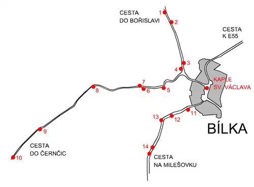 Nacházejí se podél tří cest: plastiky číslo 1 až 4 jsou podél cesty z Bořislavi do Bílky, plastiky 5 až 10 stojí podél cesty z Bílky do Černčic a plastiky 11 až 14 podél cesty z Bílky na Milešovku.