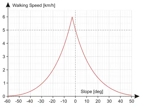 kde s je rychlost chůze zdravého člověka po upravené cestě v kilometrech za hodinu a θ je úhel sklonu této cesty v radiánech (záporný znamená klesání, kladný stoupání). Exp ve vzorci znamená exponenciálu o základu e a tan tangentu.