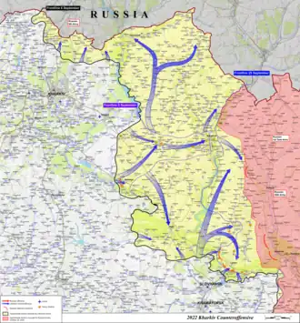 Rusové do oblasti vyslali zálohy, které měly stabilizovat situaci,[15] ovšem 8. září byla osvobozena Balaklija nebo Ševčenkove, o dva dny později Izjum a Kupjansk.[16] Do 12. září ukrajinské síly posunuly frontovou linii až k řece Oskol a vyčistily od Rusů Dvoričnou, Veliky Burluk nebo Svjatohirsk.[17] Po týdnu bojů tak byla osvobozena celá Charkovská oblast, čímž ukrajinská armáda dle řady médií a analytiků dosáhla nad Rusy zdrcujícího vítězství.[18][19][16][20][12] Dle ukrajinského prezidenta Zelenského bylo osvobozeno 6 tisíc km2.[21]