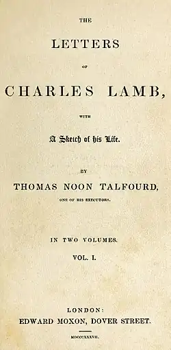 - The Letters of Charles Lamb (1837, Dopisy Charlese Lamba), dva svazky, posmrtné vydání.