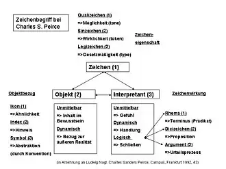 Tak ve vztahu znaku a jeho předmětu nutně vystupuje i interpretace, jež je do tohoto vztahu uvádí. Znak a jeho interpretace vydělují předmět ze souvislosti světa a umožňují tak jeho poznání. V této souvislosti zavádí Peirce známé rozlišení podle toho, zda znak a předmět spolu souvisí:
