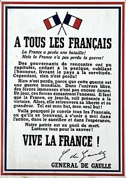 | „ | Vojenští velitelé, kteří stojí po dlouhá léta v čele francouzské armády, vytvořili vládu. S poukazem na porážku našich vojsk vstoupila tato vláda ve styk s nepřítelem, aby zastavila boj… Ale bylo tím řečeno poslední slovo? Je třeba se vzdát naděje? Utrpěli jsme snad definitivní porážku? Nikoli! Francie není osamocena! Tato válka není omezena na nešťastné území naší země. Tuto válku nerozhoduje bitva o Francii. Tato válka je válka světová. I když jsme byli nyní rozdrcení tankovými silami, budeme moci zvítězit v budoucnu silou, která bude ještě větší… Já, generál de Gaulle, v současné chvíli v Londýně, vyzývám francouzské důstojníky a vojáky, letce a námořníky, vyzývám francouzské inženýry a specializované dělníky zbrojních závodů, ať jste kdekoliv, připojte se k těm, kdo chtějí bojovat. Jednoho dne, to vám slibuji, naše spojené síly, francouzská armáda, mechanizovaná a pozemní vojsko, letectvo a námořnictvo spolu s našimi spojenci vrátí svobodu světu a velikost vlasti. | “ |