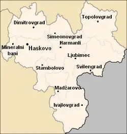 Správním střediskem oblasti je Chaskovo, kromě sídelních měst jednotlivých obštin, přičemž Mineralni Bani a Stambolovo městem nejsou, se zde nachází město Meričleri.