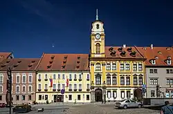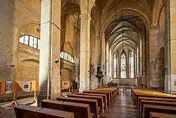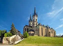 Gotický chrám svatých Mikuláše a Alžběty. Z původní románské stavby z roku 1220 jsou zachovány obě věže. Kostel byl goticky přestavěn v letech 1456–1476 na trojlodní halu. Nástěnné malby od mistra Lucase z Norimberku z téhož roku. Poškozené vrcholky věží byly barokně přestavěny roku 1746. Na konci druhé světové války byly zničeny neogotické věže, vzniklé po požáru barokních. V roce 2008 byly nahrazeny provizorní poválečné helmice replikami neogotických věží, a tak byly po více než šedesáti letech vráceny kostelu jeho proporce a charakter. Tato změna zásadně ovlivnila i panorama města.
