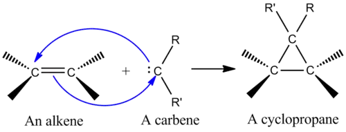Jedním z nejvýznamnějších druhů cheletropní reakce je adice singletového karbenu na alken za vzniku cyklopropanu.[2] Karbeny jsou neutrální molekuly s dvouvazným uhlíkem se šesti elektrony ve valenční vrstvě, což z těchto látek dělá velmi reaktivní elektrofily a meziprodukty některých reakcí.[9] Singletový uhlík má prázdný orbital p a hybridní orbital sp2, v němž se nacházejí dva elektrony. Singletové uhlíky se stereospecificky adují na alkeny, stereochemie alkenu se ve vytvořeném produktu zachovává..[2] Mechanismus adice karbenu na alken odpovídá [2+1] cykloadici. Karbeny odvozené od chloroformu a bromoformu lze použít k adici CX2 na alken za vzniku dihalogencyklopropanu.[10]
