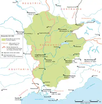 | V roce 534 království Burgundů zaniklo, stalo se součástí franské říše. Území rozděleno mezi franské krále. | |||