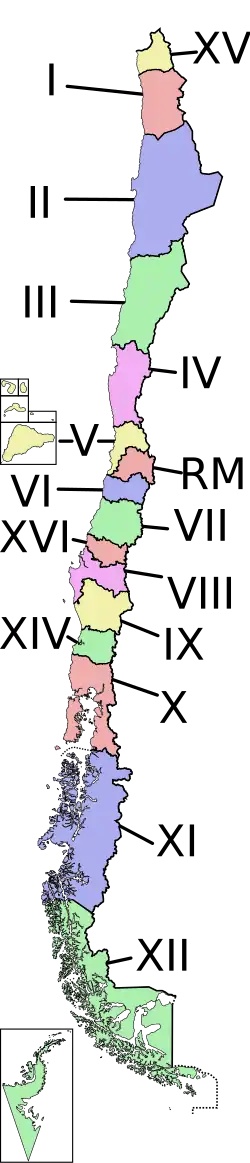 Chile je unitární stát, který je rozdělen do šestnácti regionů. Vlajky regionů jsou seřazeny od severu k jihu.