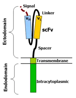 Variabilní části na těžkém a lehkém řetězci imunologlobinu jsou spojeny pomocí flexibilního linkeru do formy scFV. scFV má k sobě připojen signální peptid k řízení vznikajícího peptidu do endoplazmatického retikula a jeho následné expresi (je štěpen). Flexibilní spacer umožňuje scFV orientovat se v různých směrech, což umožňuje vazbu k antigenu. Transmembránová doména je typicky hydrofobní alfa-helix struktura, odvozena z původní molekuly signální endodomény, která vyčnívá do buňky a přenáší požadovaný signál.