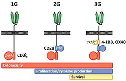 První generace CARů zpravidla měla intracelulární doménu z CD3ξ řetězce, který sloužil jako primární vysílač signálů z endogenních TCR. U Druhé generace CARů byly přidány do cytoplazmatických částí CARů intracelulární signální domény z různých kostimulačních receptorů (např. CD28, 41BB, ICOS), které poskytovali další signály T buňkám. V případě Druhé generace CARů, předklinické studie poukázaly na to, že dochází u T buněk k posílení protinádorové imunity. Novější Třetí generace CARů již kombinuje různé signalizační domény, jako je CD3-zeta – CD28 – 41BB nebo CD3-zeta – CD28 – OX40.