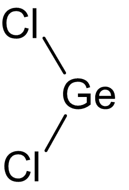 Molekulární GeCl2 se často nazývá dichlorgermylen, čímž se zdůrazňuje jeho podobnost s karbeny. Struktura molekulárního GeCl2 v plynné fázi ukazuje, že se jedná o lomenou molekulu, jak předpovídá teorie VSEPR.[4] Dioxanový komplex, GeCl2-dioxan, byl použit jako zdroj molekulárního GeCl2 pro syntézy, stejně jako reakce in situ chloridu germaničitého a germania. GeCl2 je poměrně reaktivní a vstupuje do mnoha různých typů chemických vazeb.[5]