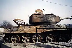 ![]() Ve směru hodinových ručiček zleva nahoře: hlavní ulice Dubrovníku, Stradun, během obléhání Dubrovníku; poškozená vukovarská vodárenská věž, symbol raného konfliktu; vojáci chorvatské armády připravující se zničit srbský tank; pamětní hřbitov ve Vukovaru; srbský tank T-55 zničený na silnici na Drniš | |||