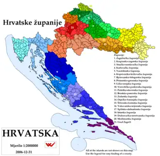 Chorvatsko se od roku 1992 dělí na 21 žup, ty se dále dělí na 556 opčin (v průměru kolem 10–20 na jednu župu) které mají podobné postavení, jako české obce.
