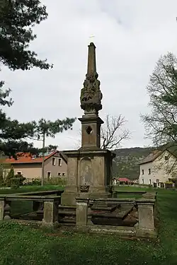 V těsném sousedství stojí renesanční kostel sv. Václava. Severovýchodním směrem od hrobky se nachází nenápadný pomník Tomášek Garrigua Masaryka pravděpodobně z 30. let 20. století. Pomník byl odstraněn v době německé okupace a ke znovuodhalení došlo v roce 1946. V roce 1948 z něho byl odstraněn reliéf prezidenta. Pomník byl znovu obnoven v roce 2008.[11] Uprostřed prostranství před kostelem byl druhotně vztyčen sloup Čtrnácti svatých pomocníků, mezi které patří sv. Jiří, Vít, Erasmus, Pantaleon, Jiljí, Kryštof, Dionýsus, Blažej, Cyriakus, Achátius, Eustach, Kateřina, Markéta a Barbora. Barokní památka z tvrdého hustého křemitého černovického pískovce pochází z roku 1716. Sem byl převezen v roce 1965 z obce Čachovice, která byla zatopena při stavbě Nechranické přehrady.[11] V letech 1994–1995 torzo sloupu restauroval akademický sochař Michael Bílek (1942–2015) z Petrovic.[8]