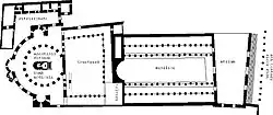 Schéma chrámu Božího hrobu se znázorněním původního terénu