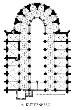 Orientovaná stavba je pojata jako pětilodní katedrála, původně zamýšlená jako bazilikální trojlodí, k němuž byly hned na počátku stavby přistavěny dvě vnější lodi. Konstrukčně se jedná o pilířový skelet. Pilíře vnějších lodí vystupují z obvodového pláště. Oproti původním plánům byly boční lodi hlavního trojlodí navýšeny do výšky hlavní lodi, nad arkádami bylo vytvořeno síňové trojlodí, následně zastřešené jako celek, patrně trojicí stanových střech křivkového spádu. Zmíněným navýšením se kostel změnil na halový typ, bazilikálně převyšující pouze přistavěné postranní lodi. Na východě je kostel ukončen protáhlým chórem s polygonálním ochozovým závěrem, v dolní polovině obestavěným obvodovými kaplemi. Kaple mají valbovou střechu a tvoří jednotný blok. Nad vnější lodi pětilodní a nad kaple chóru je vyveden rozsáhlý opěrný pilířový systém se symetricky rozmístěnými násobnými pilíři o stejné výšce, zdobenými poměrně masivními fiálami, ukončenými kytkou. Odvodnění je zajištěno pomocí figurálně ztvárněných chrličů.