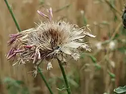 Plody jsou obvejčité, 6 mm dlouhé, ochmýřené nažky (semena) tmavě hnědé barvy, které mají víceřadý, světle hnědý chmýr s nestejnými paprsky dlouhými 1 až 5 mm. Nažky mají zřetelný dužnatý přívěsek, elaisom, kterým se živí mravenci a nažky přitom roznášejí po okolí. Kromě semen se rostlina na vhodném stanovišti rozšiřuje a mohutní i přirůstáním oddenku.[1][2][7][8][9]