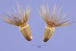 Plod je hnědá, podlouhlá, kuželovitá, mírně stlačená nažka dlouhá asi 5 mm a vážící 30 mg. Nažky jsou poměrně těžké a mají vytrvalý černohnědý chmýr velký do 8 mm.[1][2][4][5][6][7]