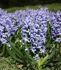 - hyacint (Hyacinthus) k výsadbě do skupin, kvete v dubnu až květnu, je mnoho odrůd v odstínech bílých, růžových, červených, modrých i žlutých, preferuje propustné půdy.