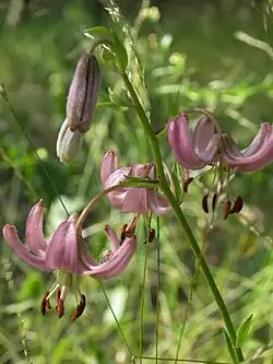 - lilie zlatohlavá (Lilium martagon) lilie původní v ČR, vysoká 60–150 cm, květy purpurově růžové, tečkované, vyžaduje humózní, vlhčí půdy.