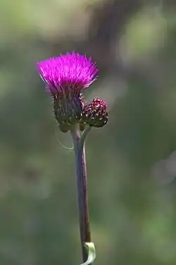 Květní úbor, květenství na dlouhé plstnaté stopce, se tvoří na vrcholu lodyhy většinou jednotlivě, řidčeji ve shlucích po dvou a více. Úbor je vejčitý, velký 3,5 až 5 cm a má výrazně červenofialovou barvu, pouze ojediněle růžovou nebo bílou. Víceřadý zákrov má fialově zelené, střechovitě uspořádané listeny vejčitě kopinatého tvaru, vnější jsou špičaté s odstálou, postupně tvrdnoucí špičkou. Květy ve všech úborech mají trubkovitou korunu srostlou z pěti laloků, uvnitř je pět tyčinekprašníkovitými trubičkami a čnělka nesoucí krátce dvouramennou bliznu, morfologicky jsou všechny květy oboupohlavné. Existuje však o něco málo více než polovina úborů s květy funkčně pouze samičími, které neprodukují pyl. U oboupohlavných květů vyčnívají fialové trubičky prašníků nad zářezy korunních cípů a blizna je přímá; po vyprázdnění pylu jsou jejích trubičky bílé. U samičích květů horní konec prašníkových trubiček bělavé barvy vyčnívá jen částečně z korunní trubky a blizna těchto květů je zvlněná. Kalich květů je v době kvetení redukovaný, později se vyvine do chmýru. Oboupohlavné květy opyluje hmyz nalákaný na nektar nebo se opylí samosprašně, k opylení samičích je nutný hmyz.