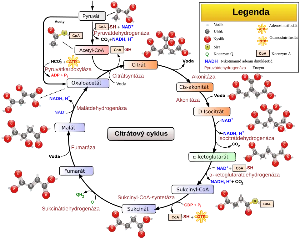 - Oxalacetát kondenzuje s dalším acetyl-CoA a cyklus se opakuje